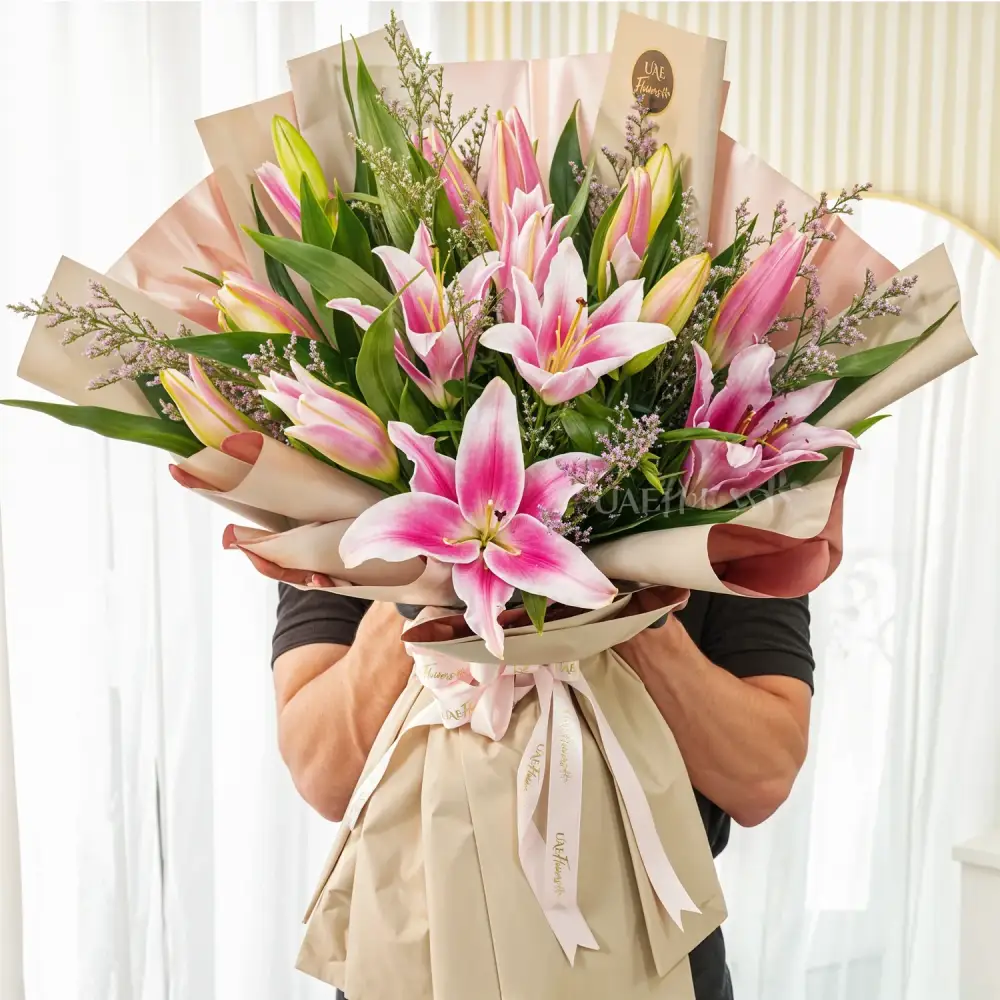 تعتبر الورود والزنابق مزيجًا مثاليًا ويمكن أن تقدم هدية زهرية مذهلة. تتضمن زنبق وردي أو أبيض حسب التوافر مع ورود حمراء في عبوة مائية. الحجم الصغير:٢٠ قطعه الحجم الوسط: ٣٠ قطعه الحجم الكبير : ٤٠ قطعه