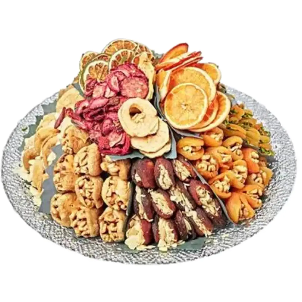 تين محشي بالجوز تين محشو بالفستق تين محشو باللوز تين محشو بالخوخ الفواكه المجففة الطبيعية (الليمون الحلو والبرتقال والتفاح والفراولة) مرتبة في صينية المصمم الوزن: 3.3 كجم (بما في ذلك الدرج)