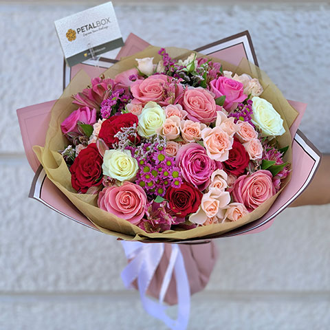 ورود مختلطة، سانتيني وردي، ألستروميريا، ورود بخاخة، ليمونيوم وردي، غلاف وردي خدود مع شريط أبيض الحجم الصغير :٢٥ قطعه الحجم الوسط : ٣٥ قطعه الحجم الكبير : ٤٥ قطعه
