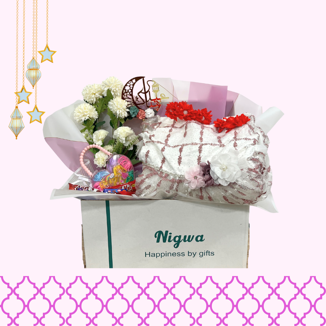 تحتوي حزم الهدايا هذه على ؛ فستان واحد للأطفال (البنات) بعمر 4-5 سنوات ، 1 مشبك شعر أحمر و 2 مشبك شعر ، قطعة واحدة من إكسسوارات البنات ، وشوكولاتة صغيرة متنوعة ، وزهور منعشة من نجوى. تسليمها في علبة نيجوى.