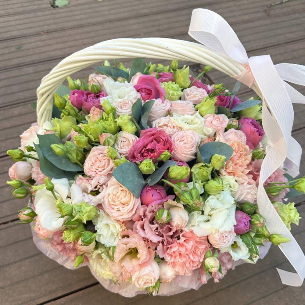 Роза кустовая - 7 pcs Эвкалипт - 5 pcs Корзина плетеная - 1 pcs эустома розовая - 5 pcs Оазис флористический - 4 pcs эустома белая - 3 pcs Диантус сортовой - 7 pcs Мистик баббл - 3 pcs Hide Size Width - 45 cm Height - 55 cm