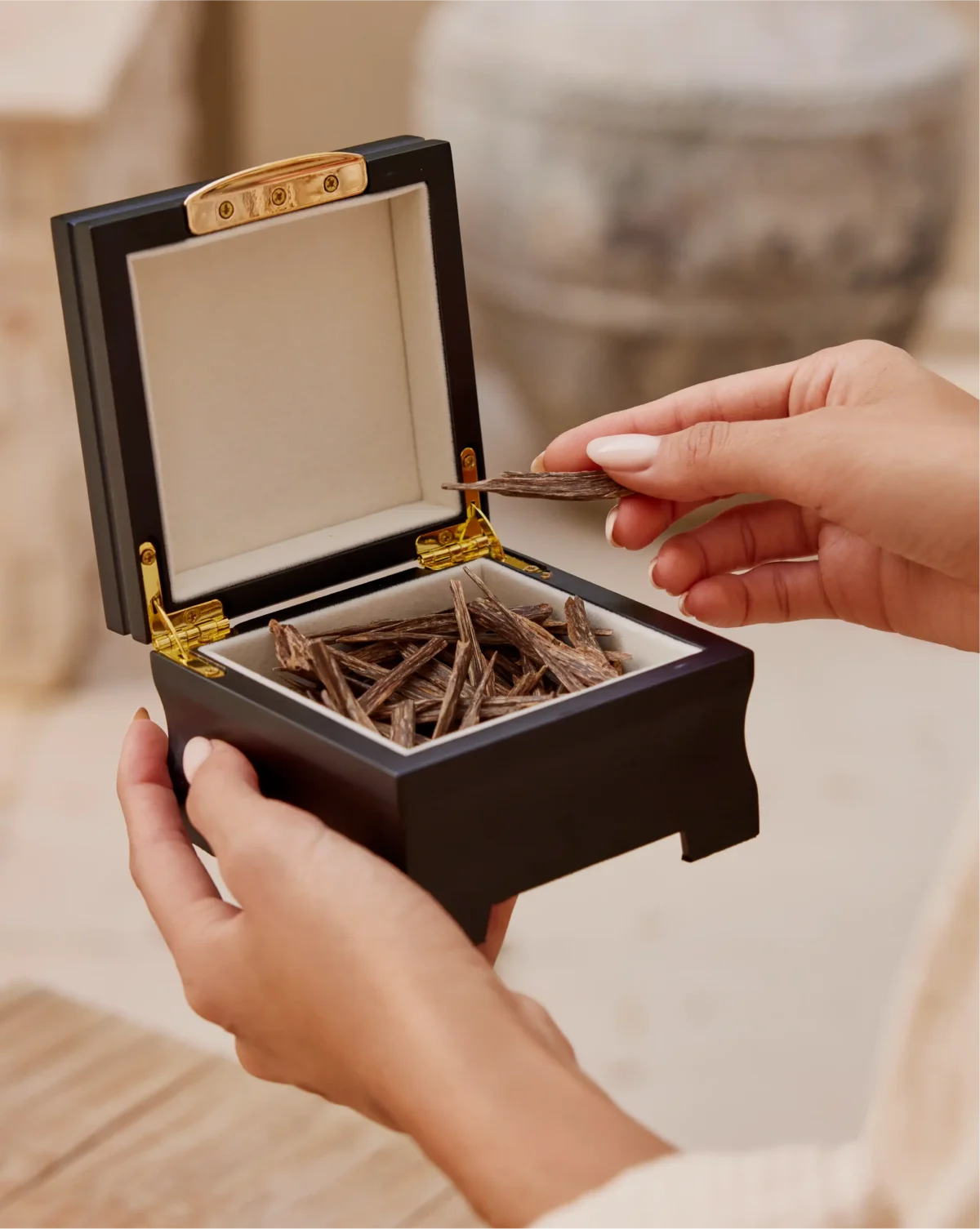 عود هندي خاص يُجسّد الفخامة والإبداع في عالم العود. · يُمثّل أجود أنواع عود السالا/الصوفي الهندي. · كل قطعة مختارة مصنوعة بدقة متناهية، مُشكّلة من طبقات سميكة شبه مستقيمة من خشب العود. · بلونه الداكن والقوي، يضمن جودة فريدة ورائحة زكية. · يأسر هذا العود الفاخر حواسك ويترك انطباعًا يدوم، ويُطلق رائحة بخور حلوة وناعمة. · ينشد عود هندي خاص الأناقة والرقي، وهو تحفة فنية حقيقية في عالم العود الفاخر. · مناسب للاستخدام الشخصي والمناسبات. الوزن: 3.6 تولة (42 غرامًا)
