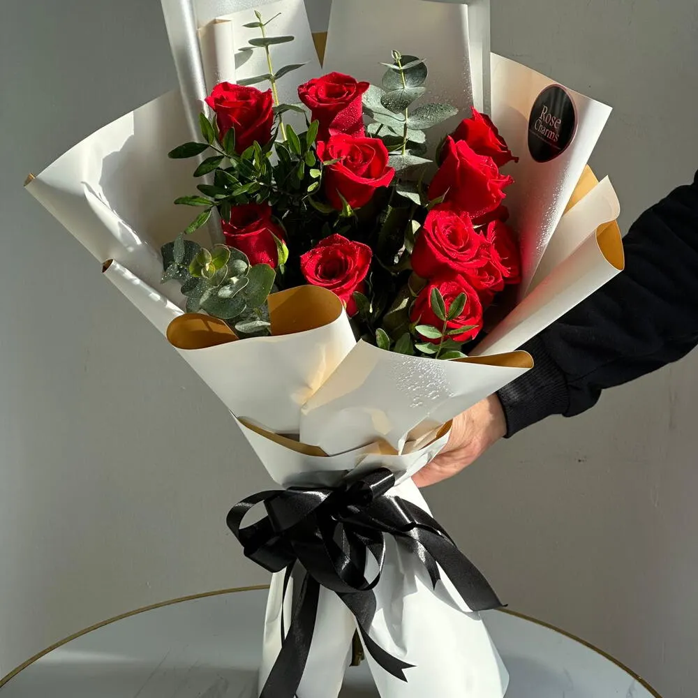 بوكيه الورد الاحمر مع الاوراق وورد الجبسو