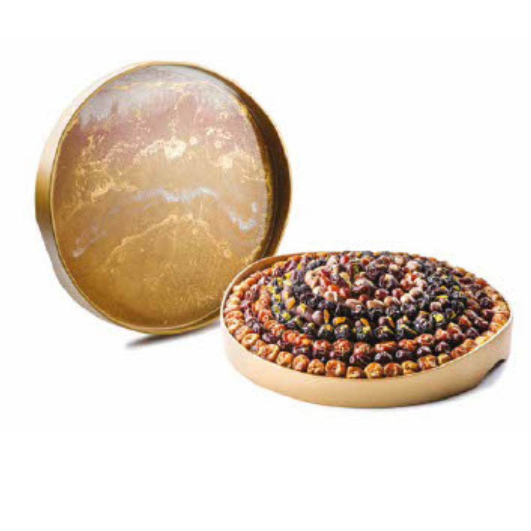 صينية فنية جميلة من الراتنج الذهبي مستوحاة من صحراء الإمارات العربية المتحدة 2750 جرام التمور المتنوعة، التمور المحشوة المتنوعة والشوكولاتة