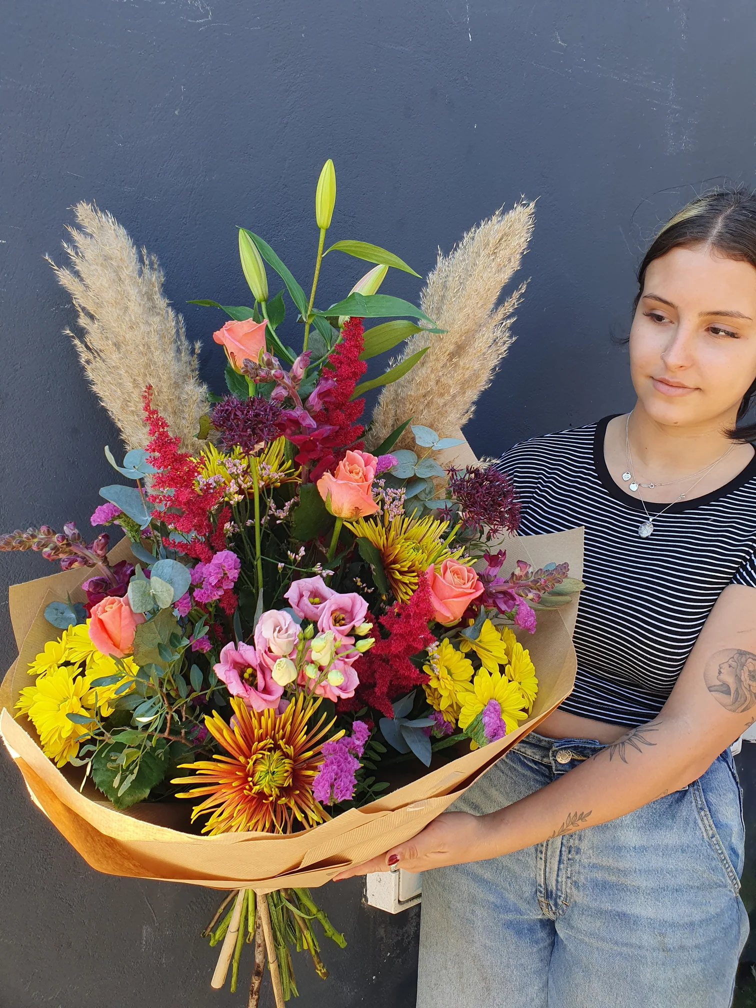 This bouquet is a show stopper. A gorgeous front facing design featuring gorgeous fluffy pampas grasses and seasonal flowers. Filled with the seasons best blooms, handpicked by our skilled florists. Please note due to seasonal availability flowers and colours will vary.