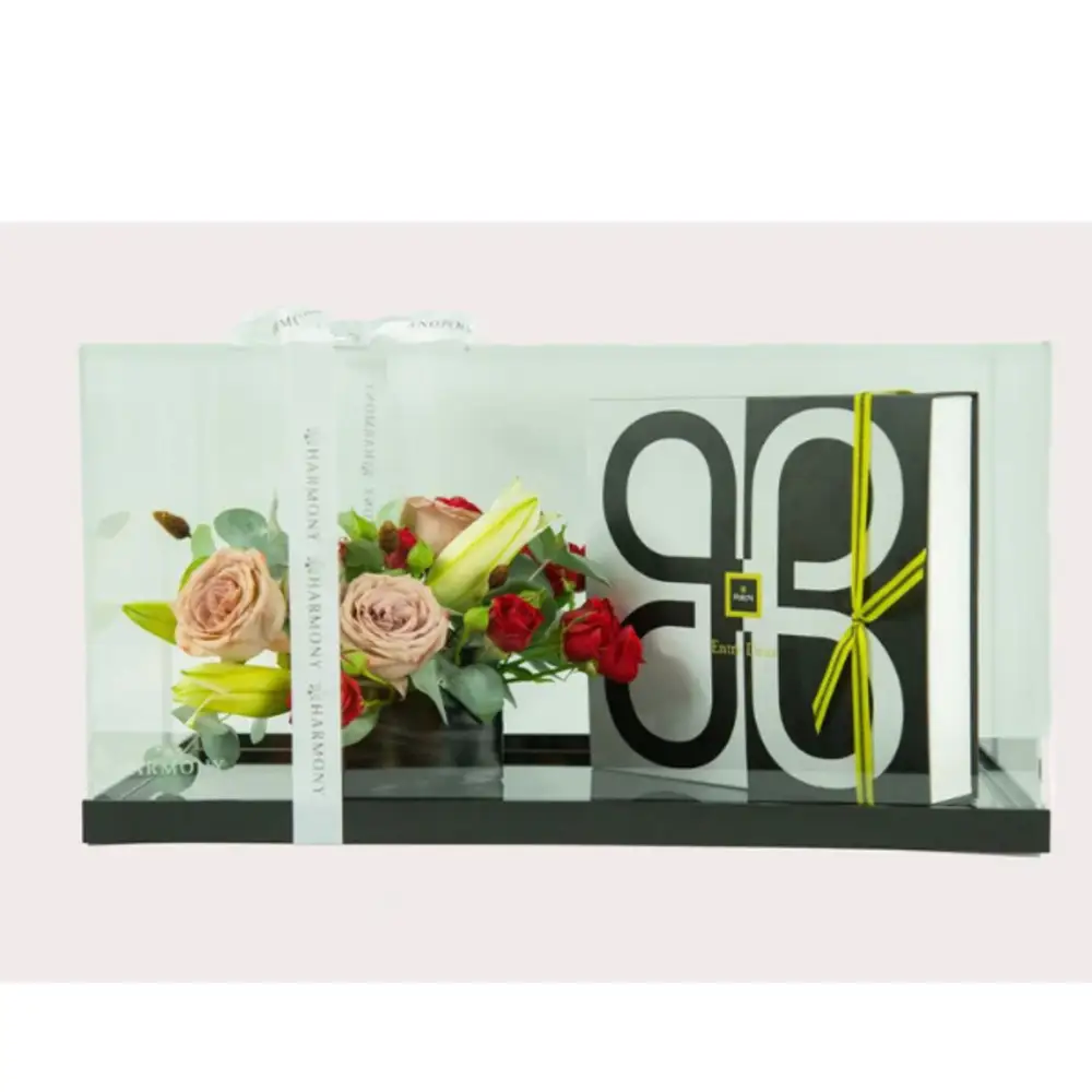 حزمة رائعة مصنوعة من الدمشقي والورود الوردية والحمراء الدائمة، إلى جانب صندوق رائع من شوكولاتة باتشي.
