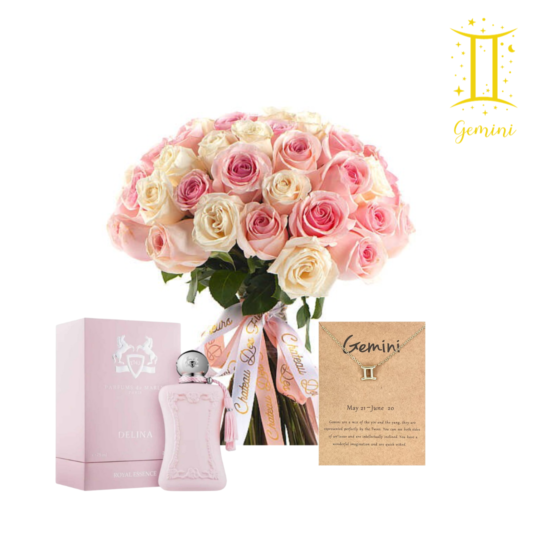 تحتوي هذه الباقة على عطر رويال وبوكيه ازهار الروز وطوق الأبراج