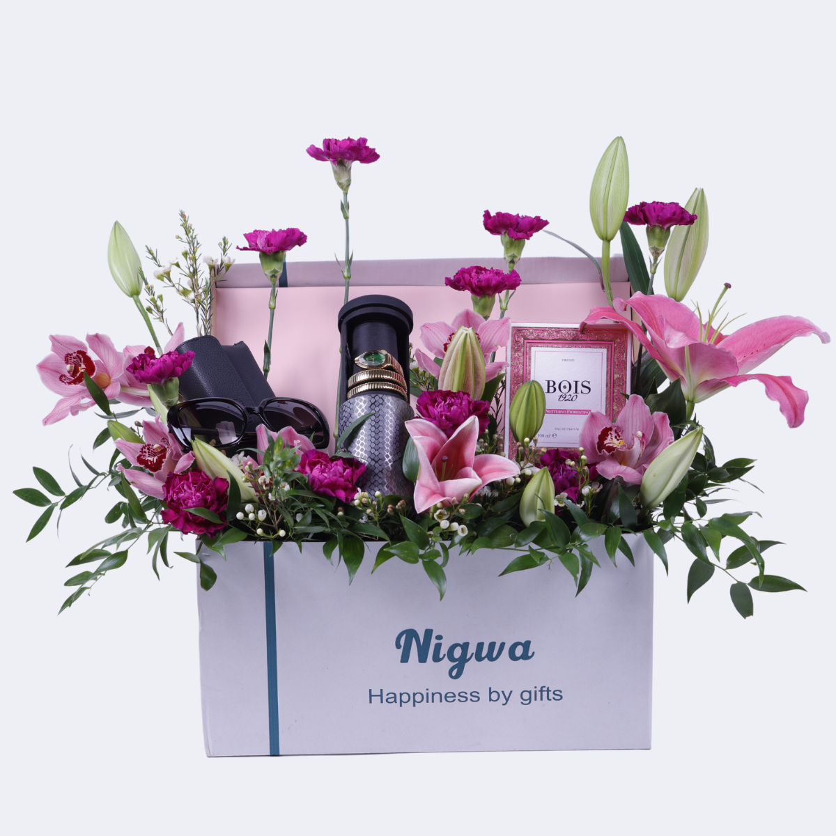 تُعد Watchful Mom Bundles هدية مثالية لأمك ، وتشمل هذه الحزمة ساعة Just Cavalli الأصلية ، وعطر Bois 1920 الأصلي 100 مل ، ونظارة شمسية أصلية من Dior وجاهزة للزهور في علبة من Nigwa.