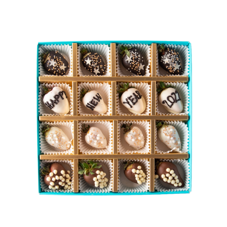Your Gift Contains: • 16 pieces chocolate covered strawberries • 4 pieces dark chocolate strawberries • 4 pieces milk chocolate strawberries with rice Krispy • 8 white chocolate strawberries Box Size: LxBxH: 24x24x4cm HANDLING AND STORAGE Keep away from direct heat and sunlight Best stored between 8-12 °C Suitable for vegetarians PREPARED IN A FACILITY WHERE NUTS ARE USED