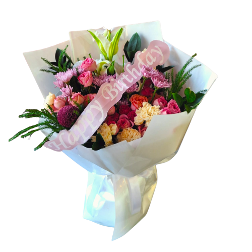 A bouquet of colorful flowers with a happy birthday ribbon small size : 30 pcs medium size : 40 pcs large size : 50 pcs