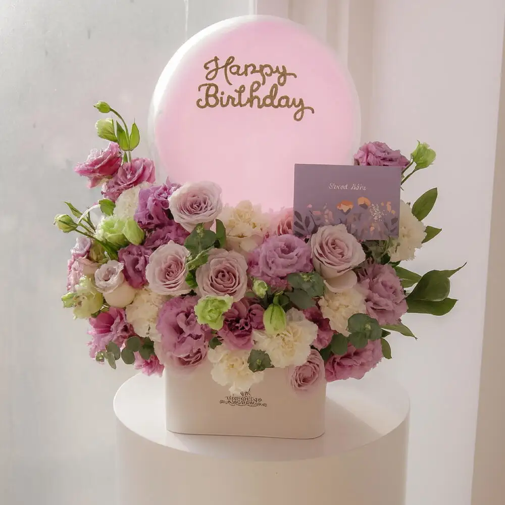 Lisianthus - 5 pcs rose - 5 pcs carnations white - 10 pcs oculyptus leaves - 3 pcs ballon with gold happy birthday sign - 1 pcs