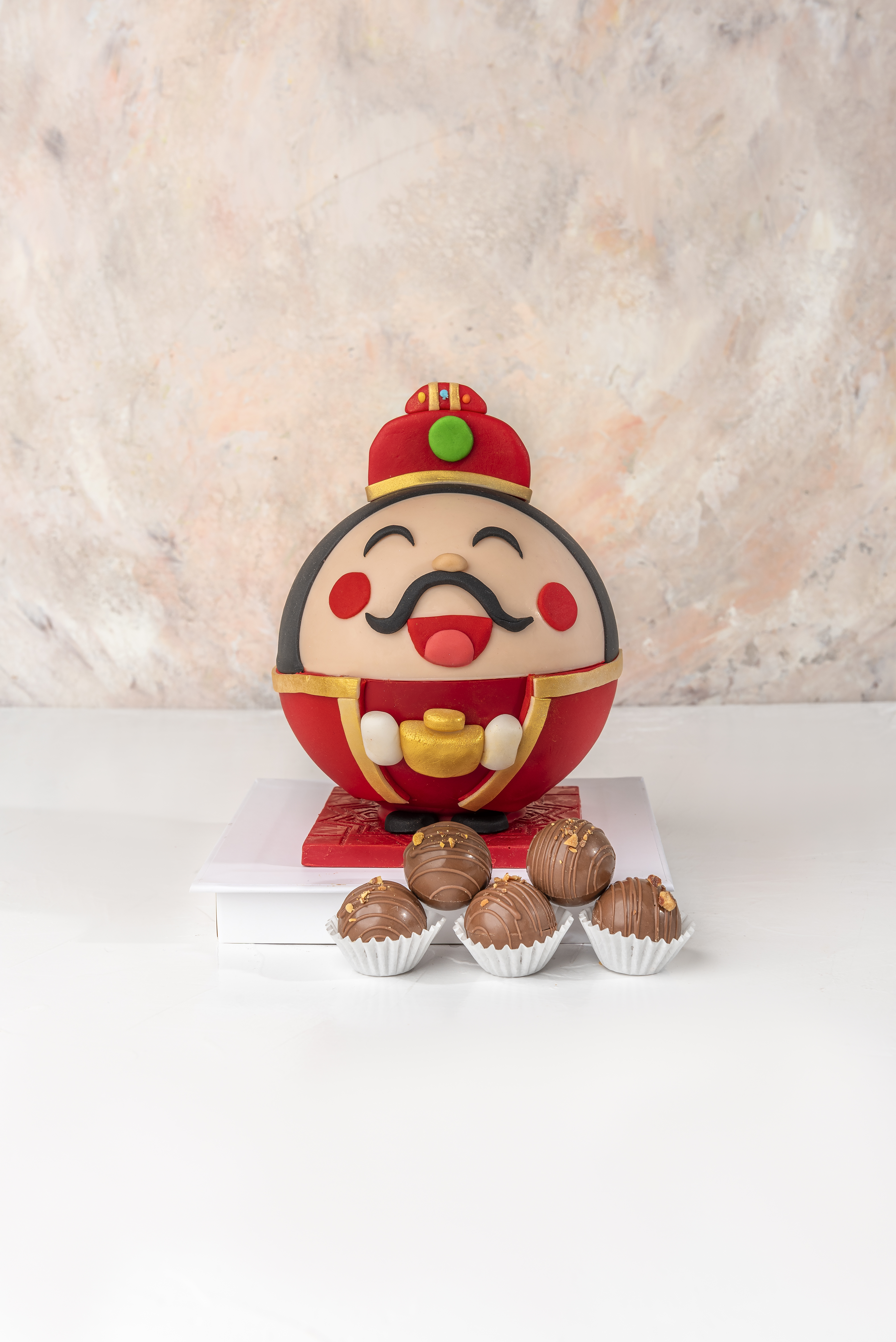 Your Gift Contains: • Chinese Royal Smash Ball • 10 Milk Chocolate Truffles • Flavors: Pistachio, Hazelnut, Speculoos, Peanut Butter and Roche • 1x Hammer • Chocolate Weight: Approx. 550grams • Chocolate Size: 12x12x14cm • Box Size: 16x16x20cm Handling and Storage • Keep away from direct heat and sunlight • Best stored between 12-18 °C • Suitable for vegetarians • Not suitable for those allergic to seeds, nuts, dairy CONTAINS NUTS AND NUTS BASED PRODUCTS