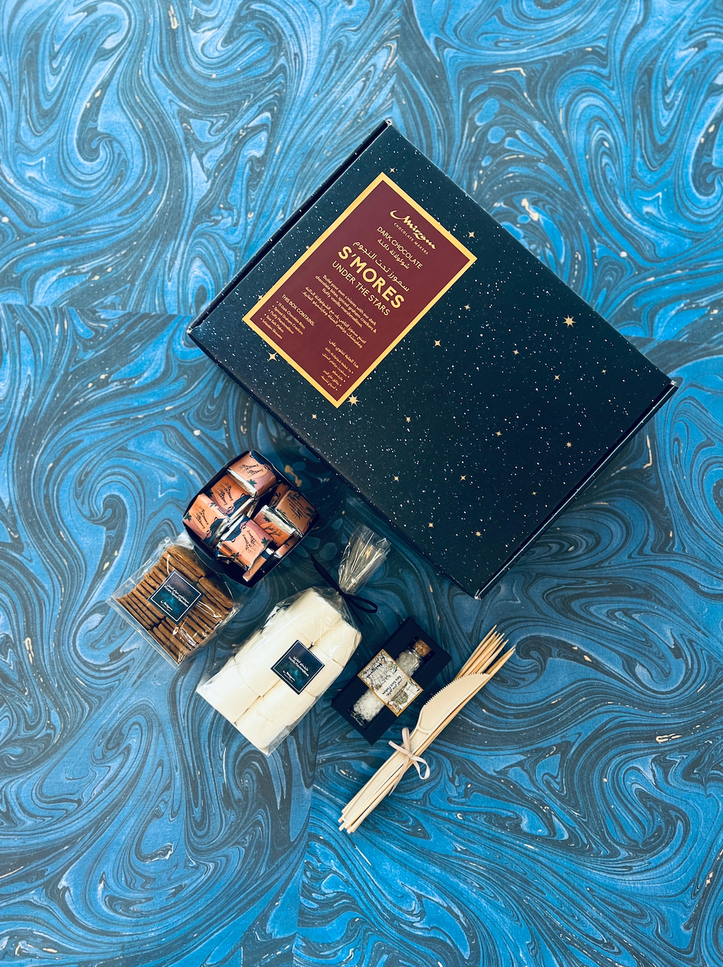 Build your own s’mores with our dark chocolate bites, spiced graham crackers & fluffy vanilla marshmallows. This beautiful black box contains all the goodies needed to DIY 15 s’mores: 15 Dark Chocolate Bites Spiced Graham Crackers Fluffy Marshmallows Sea Salt Flakes Wooden Skewers & Knife Ideal to enjoy around a camp fire, under the stars! 1