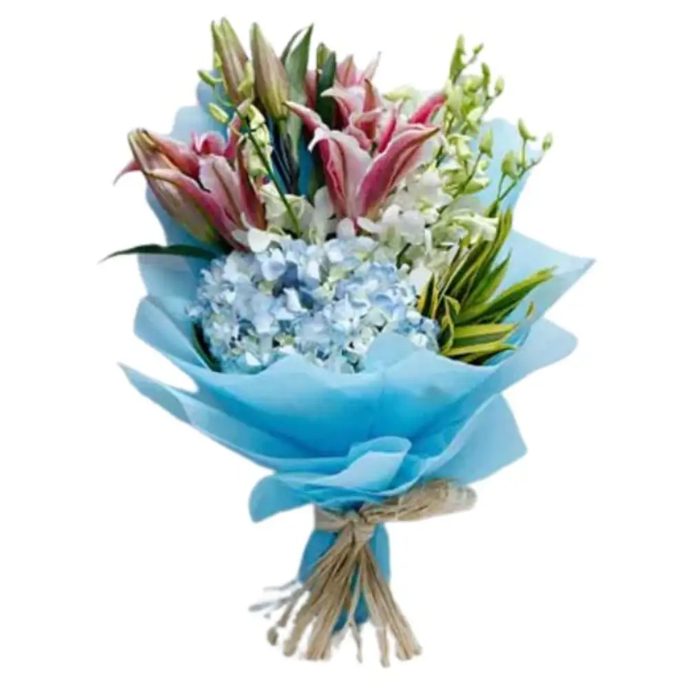 A masterpiece bouquet with White Orchids, Pink Oriental Lilies & Blue Hydrangea wrapped with Sky Blue Non Woven Paper & Blue Hand Woven Paper