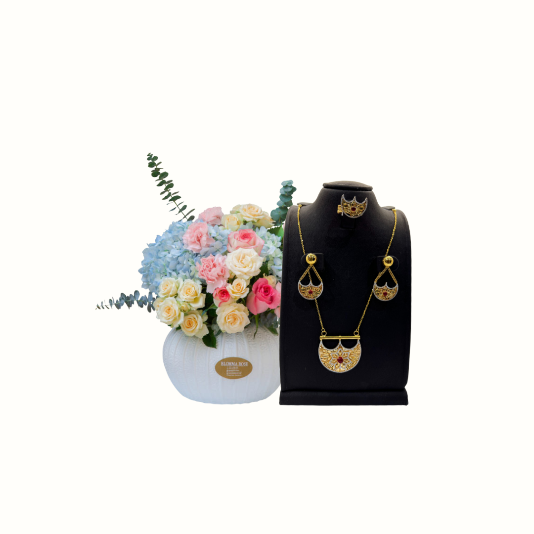 This Gift package contains; 1 set of 22 carat Gold Necklace by Al Yafai Jewelries, and Vase of flowers by Nigwa. Perfect for gifting.