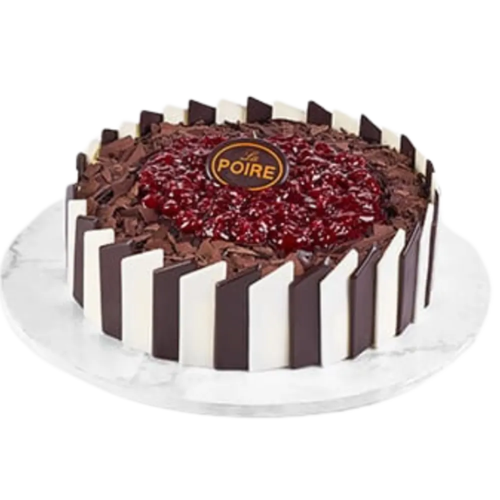 1/2 CHOCOLATE; 3 LAYERS OF CHOCOLATE SPONGE CAKE FILLED WITH CHOCOLATE CREAM. 1/2 VANILLA; 3 LAYERS OF WHITE SPONGE CAKE FILLED WITH LA POIRE'S SPECIAL CREAM AND TOPPED WITH PINEAPPLE AND PEACH.