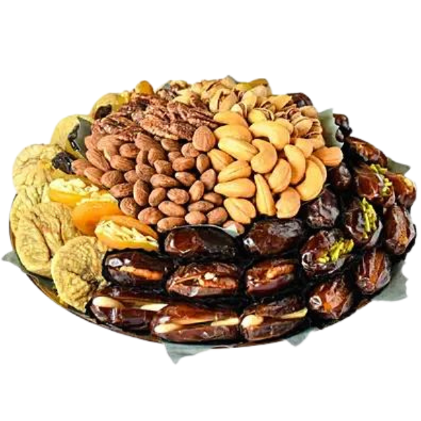Stuffed Apricot Stuffed Dates Stuffed Figs Roasted Cashew,Pista,Almonds,Pecan Nuts Arranged Beautifully in a Tray Weight - 1.35 Kg