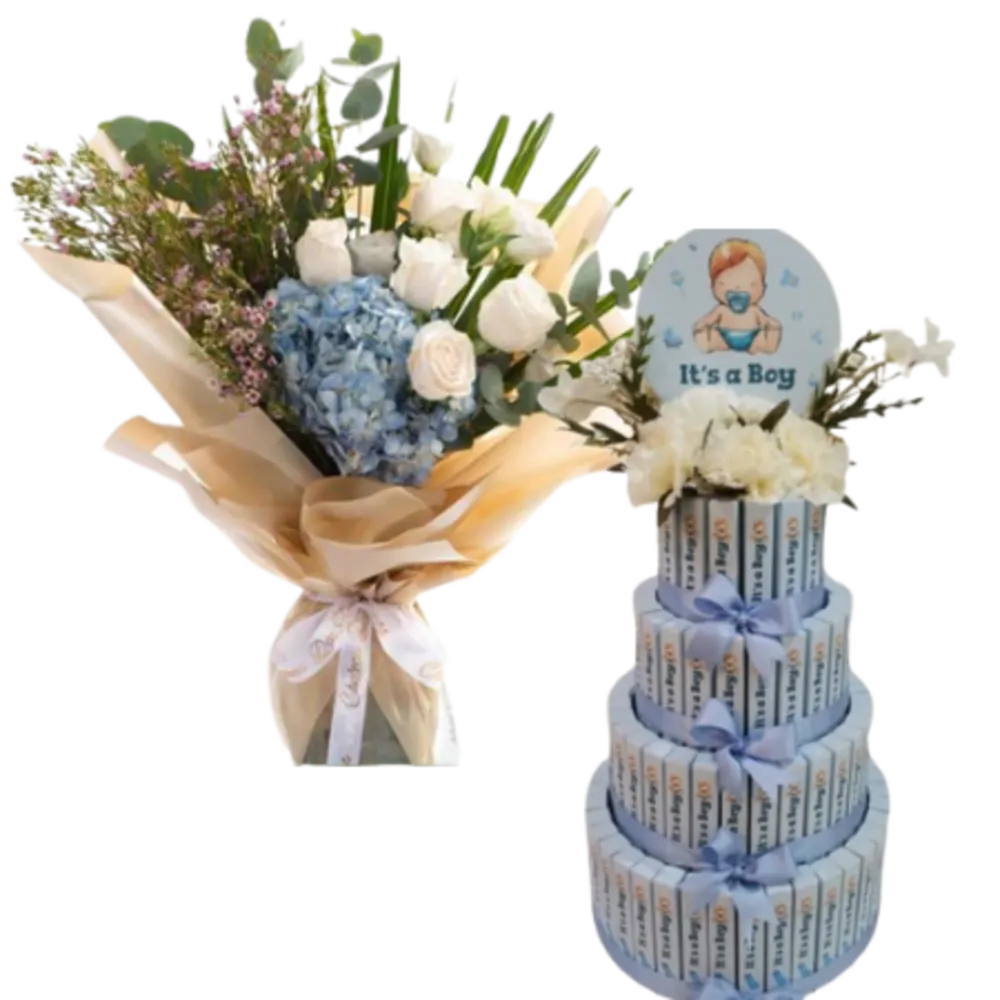 Mixed pink, white and blue roses for newborn with chocolate