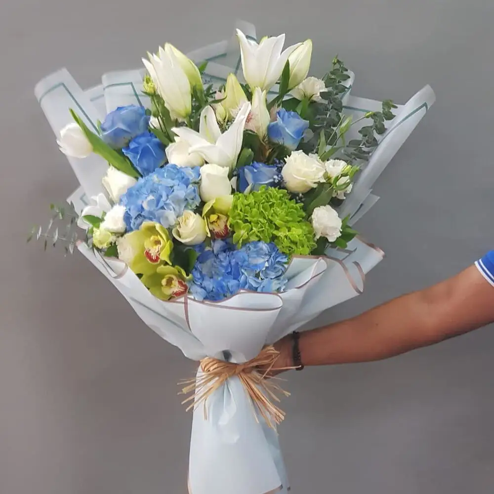 Send this thoughtful gift to your special someone! Our charming arrangement is gathered with a medley of blue hydrangeas, white roses, and stunning lilies. Hand-designed with cascading greenery all around. small size : 30 pcs medium size : 40 pcs large size : 50 pcs
