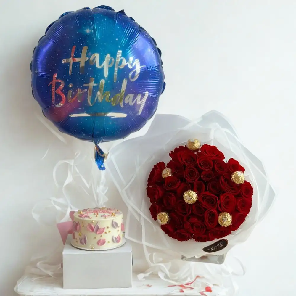 Red rose - 20 pcs ferrero rocher chocolate - 6 pcs happy birthday foil balloon - 1 pcs floral cake with moist chocolate ganache filling - 500 g