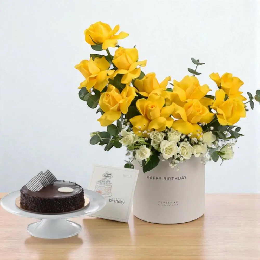 Sunshine Snowflakes Birthday Box with Chocolate Cake – Yellow White Rose Floral Gift Set