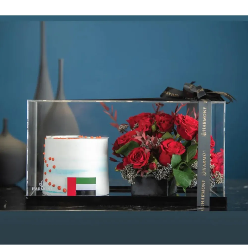 For UAE National Day and other celebrations, indulge in some delectable UAE flag cake with exotic red roses.